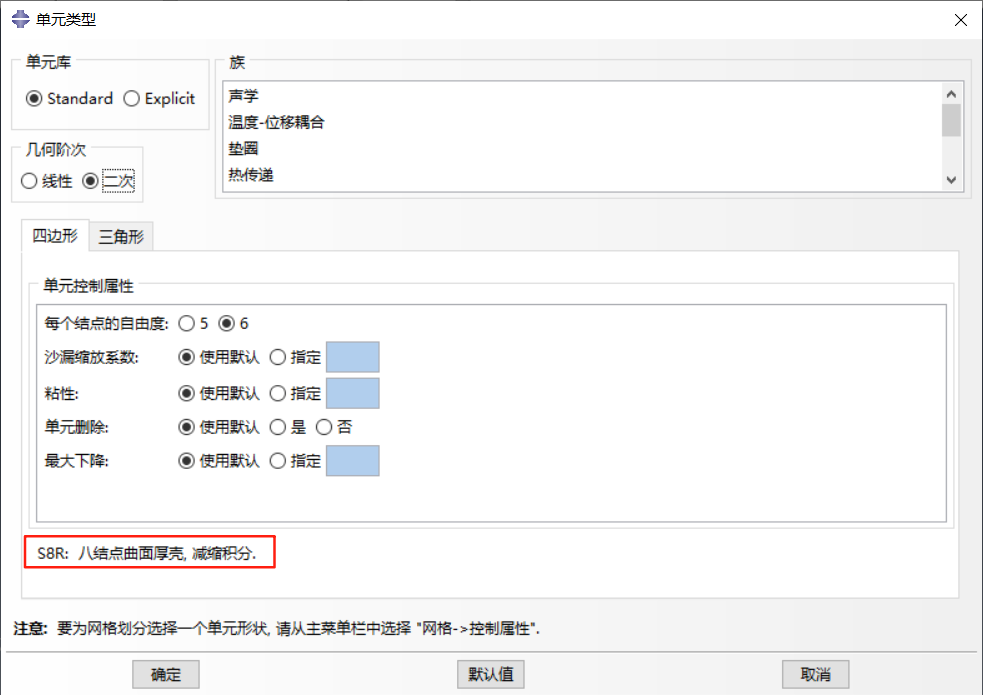 厚壳单元:如 S8R、S8RT 等,二阶四边形单元,在小应变和载荷使计算结果沿壳的跨度方向上平缓变化的情况下,比普通单元产生的结果更精确。