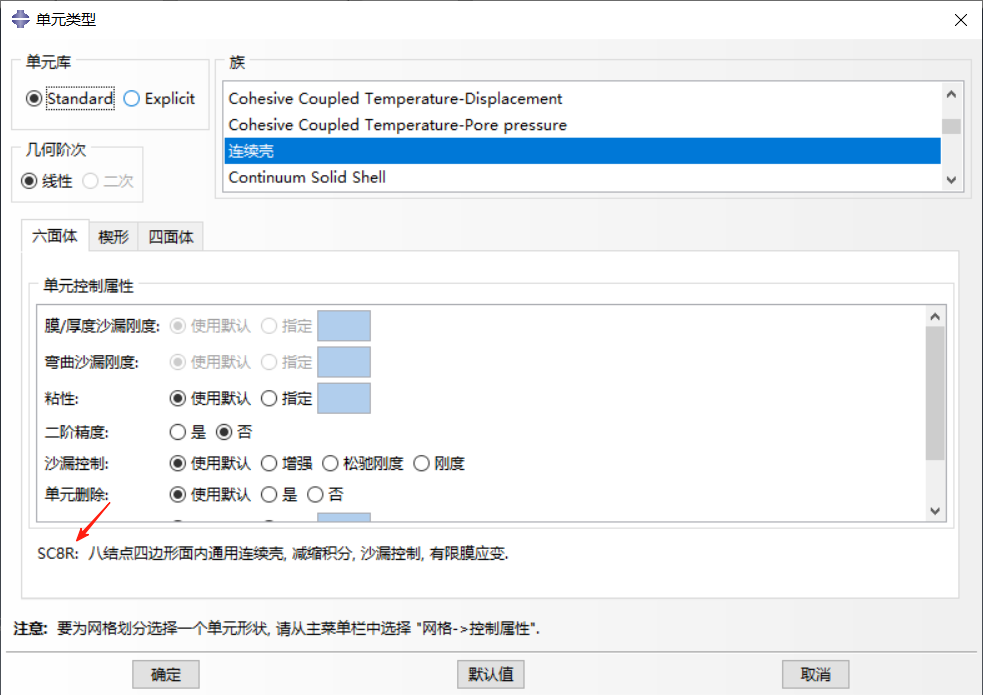 连续壳单元:如 SC6R(6 节点线性单元)和 SC8R(8 节点缩减积分单元),用于复合材料层合板建模,能够更准确地描述复合材料厚度方向的剪切变形。